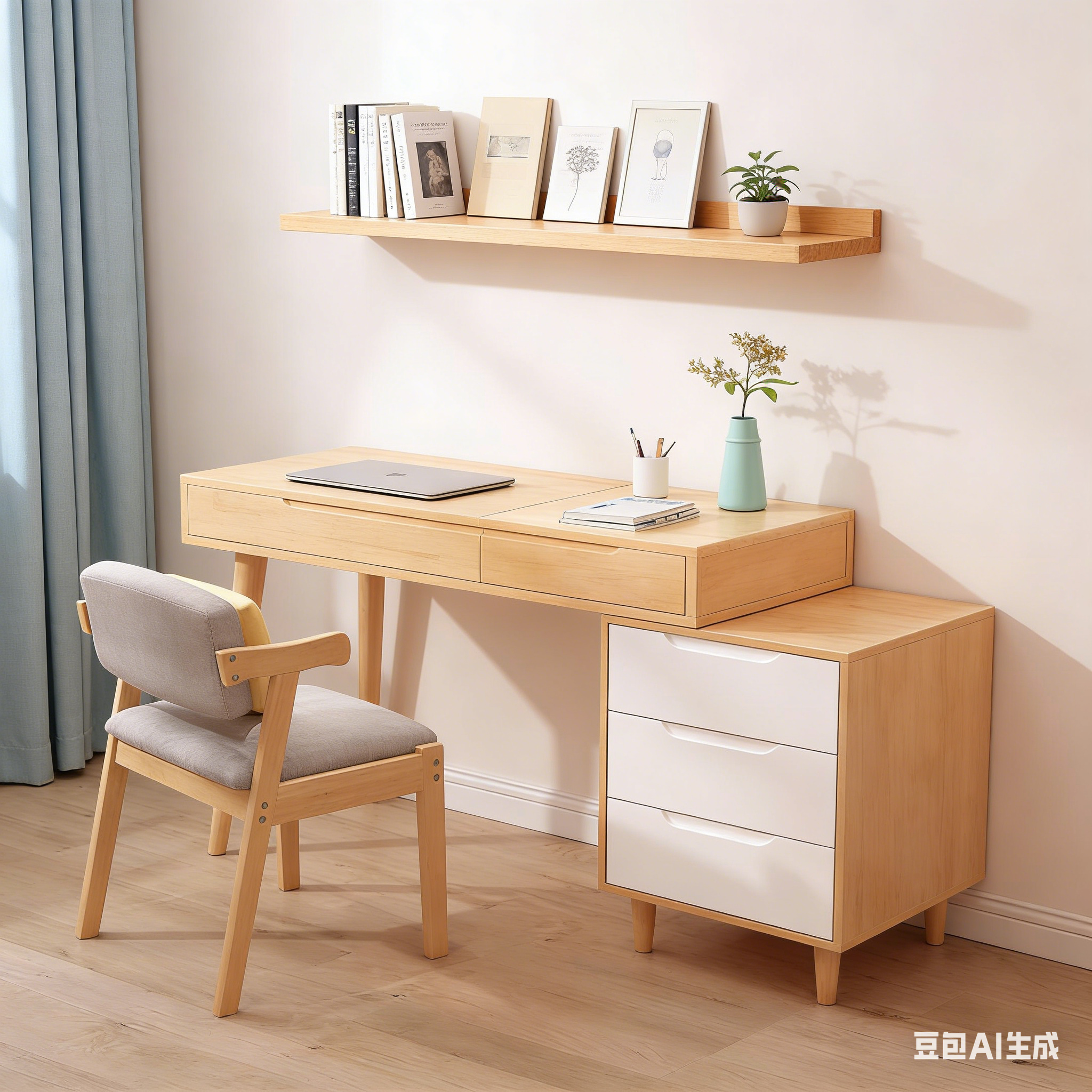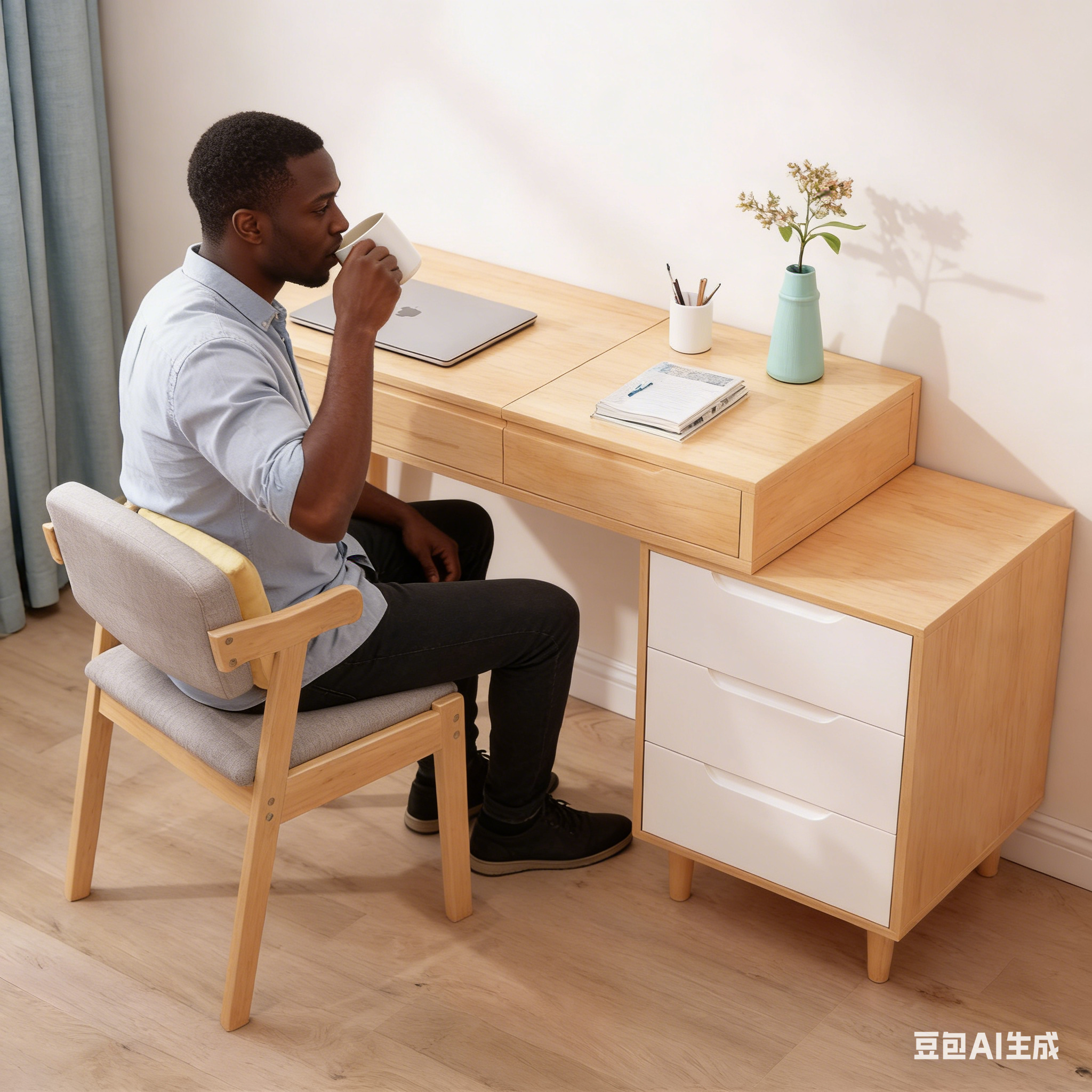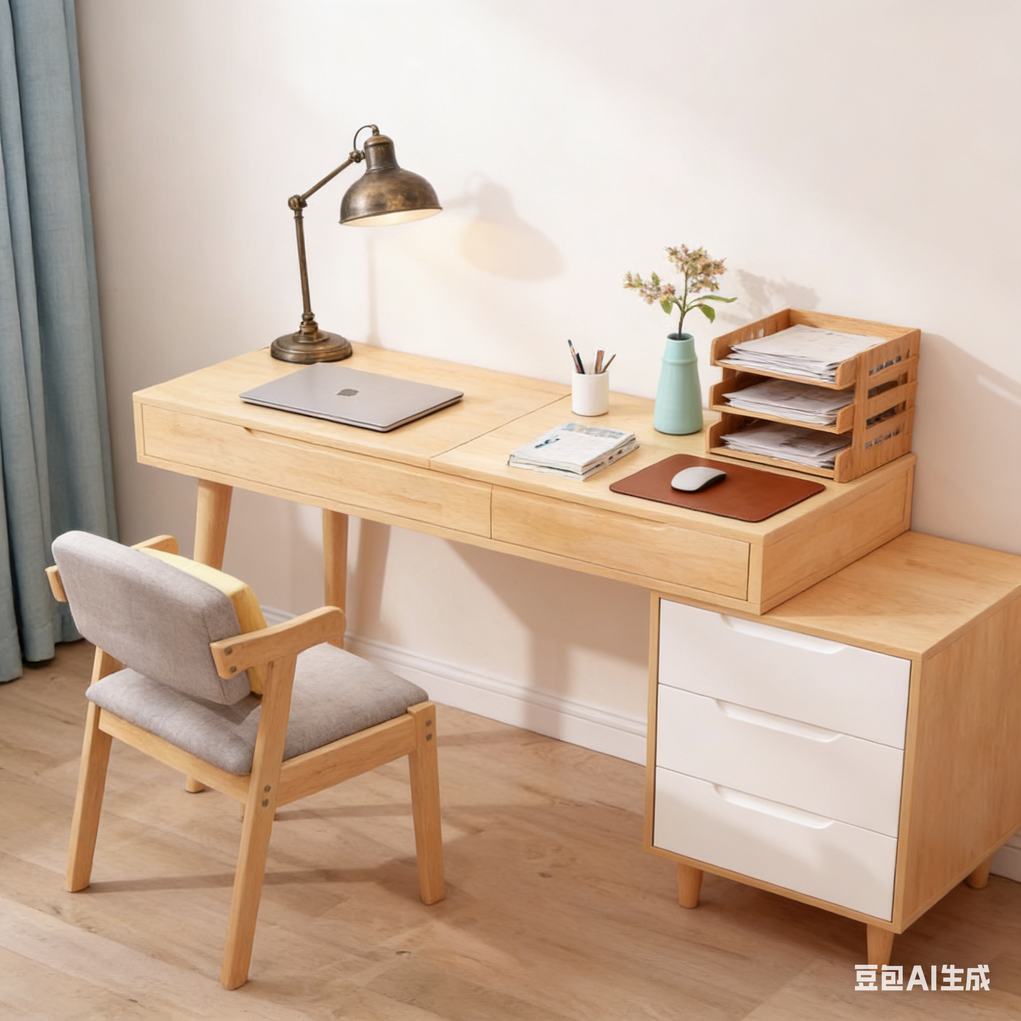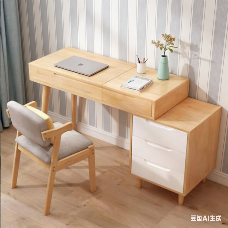 Le bureau extensible et le meuble latéral à trois tiroirs permettent une installation flexible dans tous les intérieurs, qu'il s'agisse d'un appartement à Casablanca, d'une cour traditionnelle à Marrakech ou d'une résidence moderne à Rabat, répondant ainsi facilement aux besoins de travail, d'étude et de rangement.