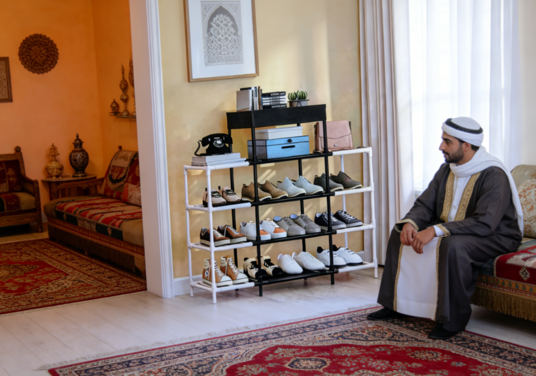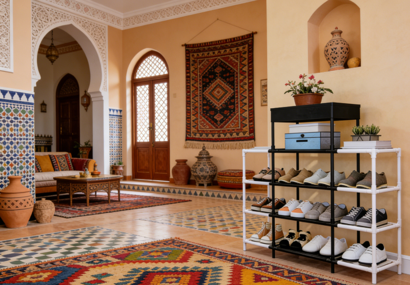 مُكيّف مع العادات المحلية: يسمح تصميمه المفتوح والمتدرج بالوصول السريع والسهل إلى النعال الجلدية التقليدية والأحذية الجلدية والأحذية الطويلة، مما يعكس العادة المغربية المتمثلة في تغيير الملابس عند دخول المنزل وكرم الضيافة الذي يقدمه الضيوف.