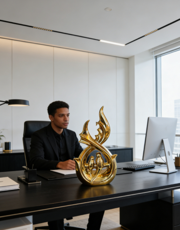 « J'ai installé cette pièce dans mon studio à Casablanca. Les lignes dorées s'harmonisent parfaitement avec les murs blancs ! Mes clients sont toujours attirés par elle lorsqu'ils viennent en réunion. Ils la trouvent à la fois moderne et pleine de charme oriental ; elle crée une ambiance unique. » — Rashid | Architecte