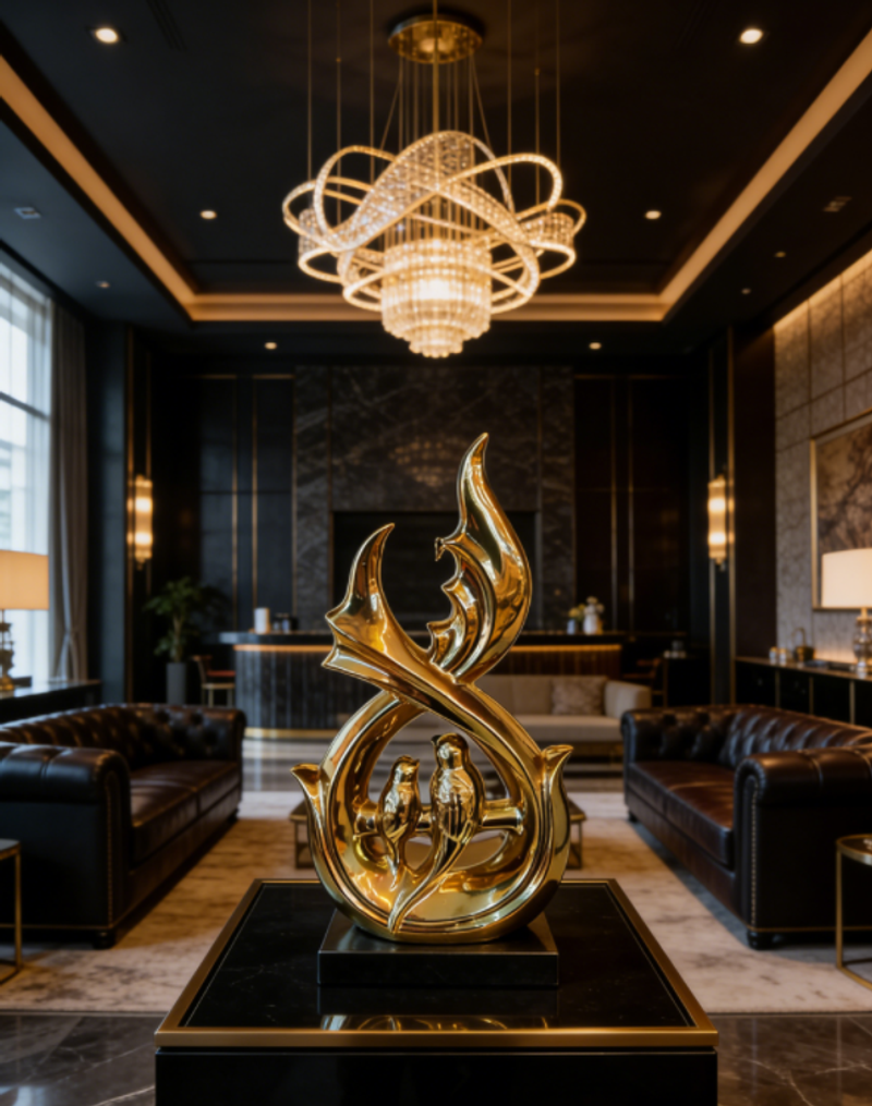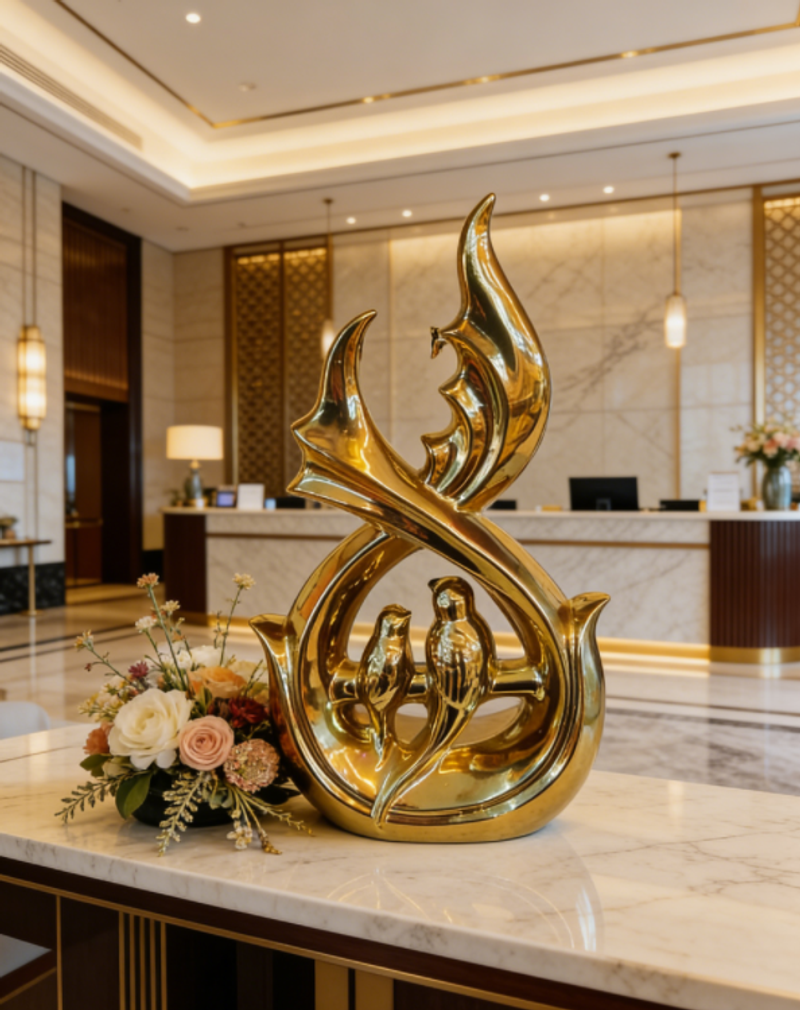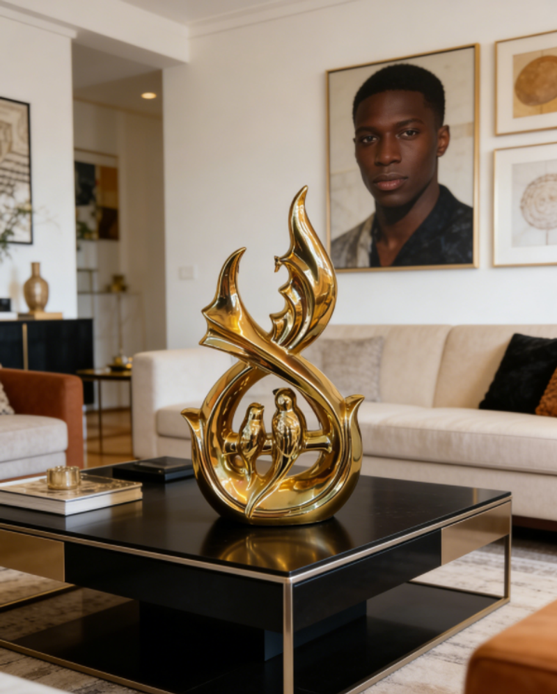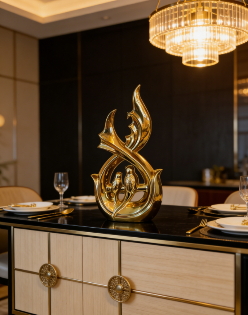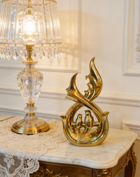 هذا العمل الفني الذهبي، بمنحنياته المتدفقة والمبهرجة التي تشكل هيكله وببغاواته المتشابكة التي تمثل روحه، يمزج بين الرومانسية المغربية والأناقة الشرقية في كل شعاع من بريقه الذهبي.