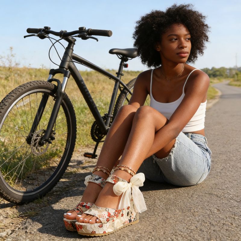 Sandales artisanales à motif floral et nœud décoratif : Comme sur la photo, ces sandales arborent de délicats motifs floraux et un nœud en ruban ajustable à la cheville. Elles sont parfaites pour les sorties entre amis, les flâneries sur les marchés en plein air ou les vacances à la plage.