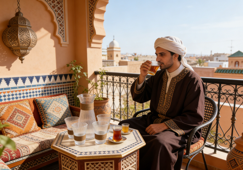 « J'adore travailler sur mon balcon, et ce service à eau est du plus bel effet sur ma table en bois de style marocain ! Le verre est clair et limpide. Préparer une tasse de thé à la menthe en regardant la lumière du soleil filtrer à travers les rayures est un vrai plaisir. Mes amis en emportent toujours un chez eux quand ils viennent me rendre visite. » – Karim | Freelance à Rabat