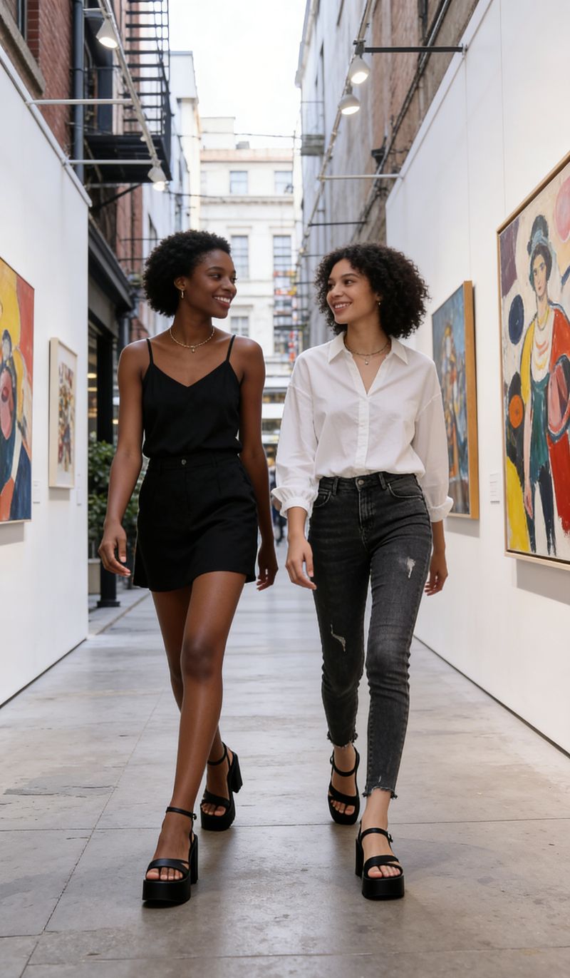 Parfaites pour les sorties entre amies : Comme le montre la photo, ces chaussures à plateforme sont idéales pour flâner dans les galeries d'art ou les rues animées du Maroc, alliant style et confort.