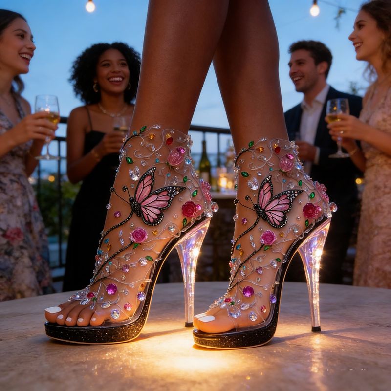 Escarpins uniques ornés de papillons et de fleurs en strass : Comme illustré, ces escarpins sont ornés de motifs de papillons et de fleurs, et parsemés de strass colorés. Ils sont parfaits pour les mariages, les dîners formels ou les grandes soirées.