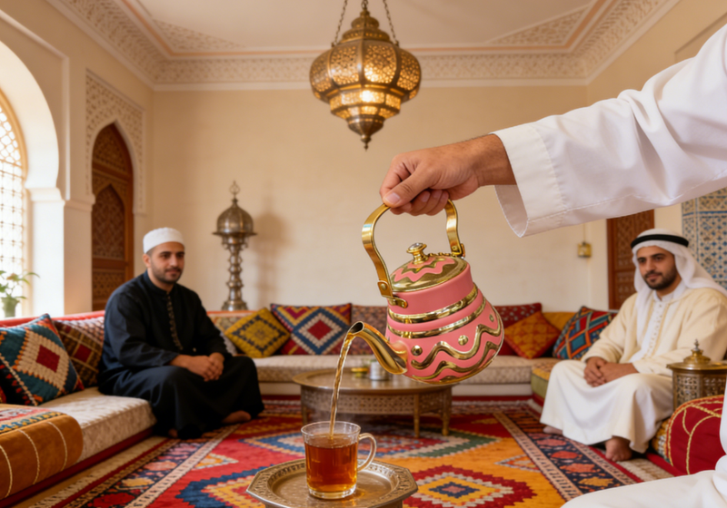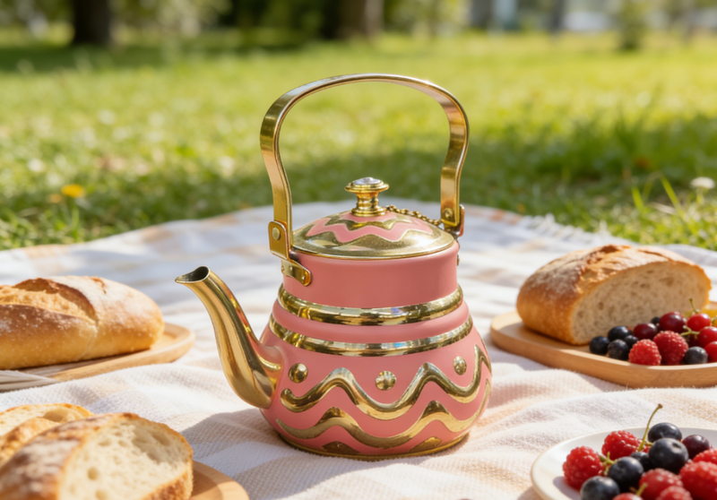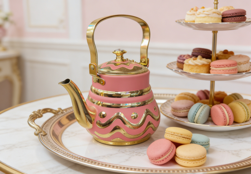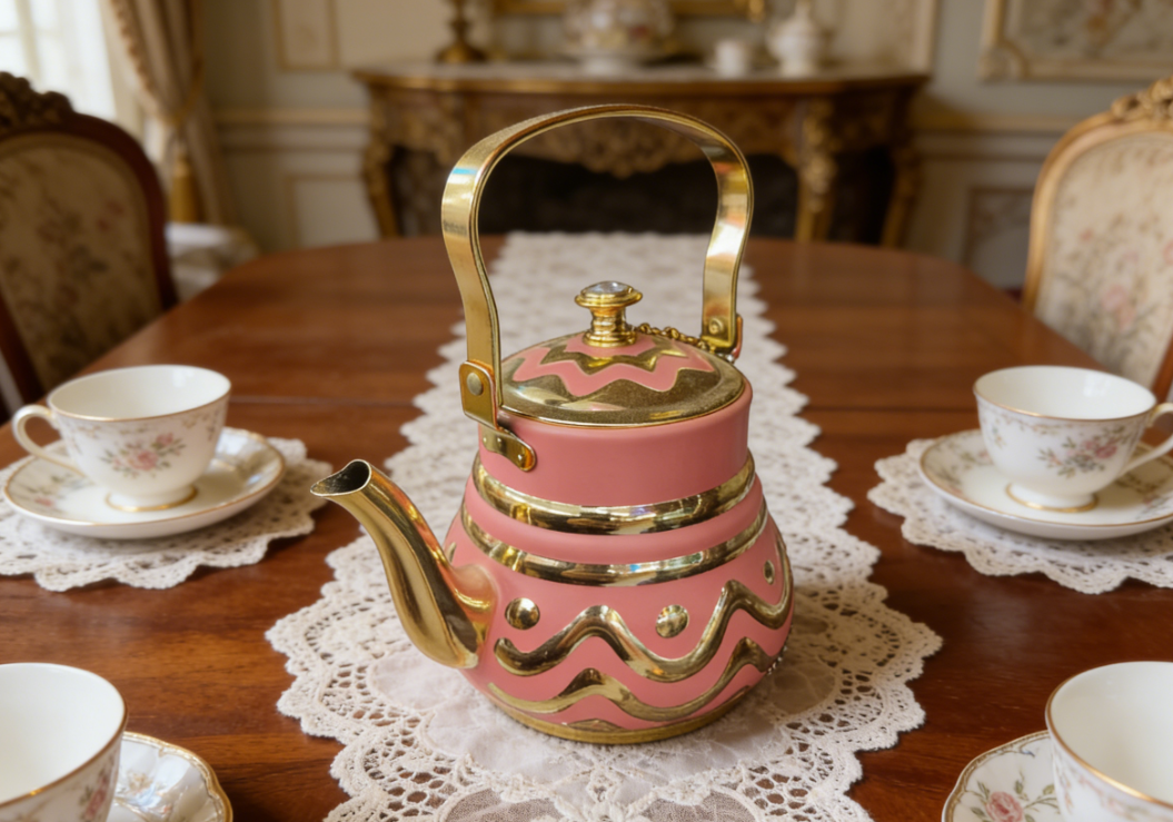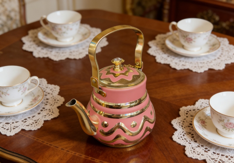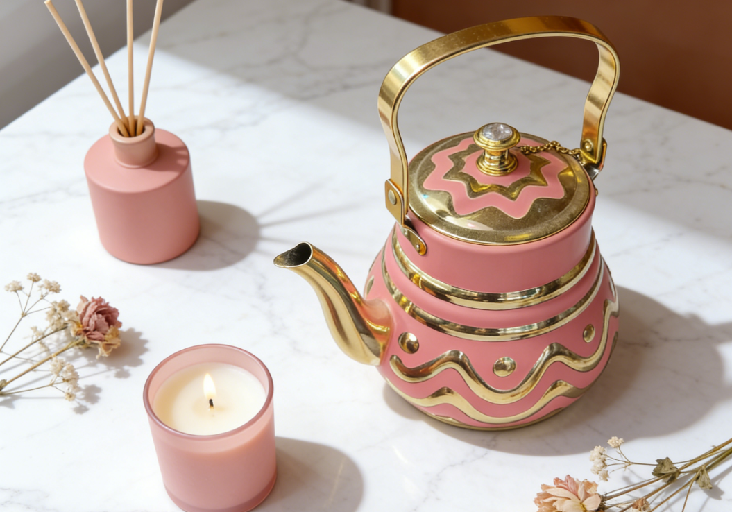 لقد جسّدنا سحر الدار البيضاء الرقيق في إبريق الشاي الوردي والذهبي المصنوع يدوياً هذا.